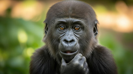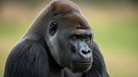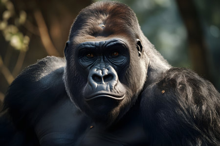This image showcases a close-up portrait of a gorilla with dark fur. The subject is well-lit, with focus on the face and eyes. The background exhibits a soft, blurred effect, potentially suggesting an outdoor environment. This photograph could be used for wildlife documentaries, educational materials, or general illustrative purposes.