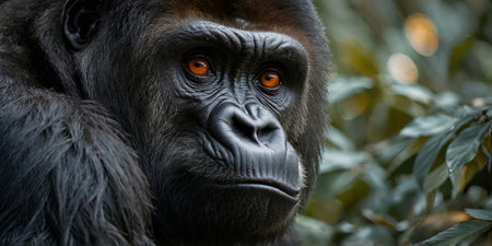 AI Generated. A captivating close-up of a gorilla's face highlighting its intense, mesmerizing orange eyes showing the depth and emotion of wildlife