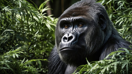 AI Generated. Gorilla peering through lush green foliage, displaying contemplative eyes and a sense of wisdom in the wild