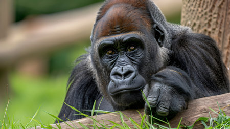 Gorilla resting head on wooden log with thoughtful, pensive expression