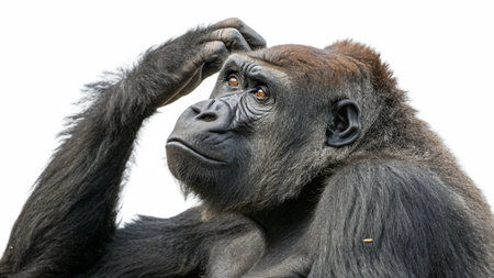 Adult gorilla, seemingly in deep thought, isolated on a white background