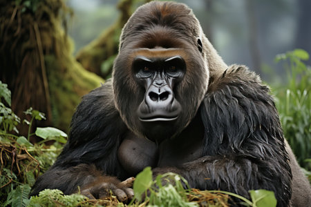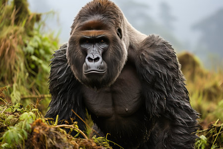 Intense gaze of a powerful gorilla amidst the mystical fog of its dense forest home
