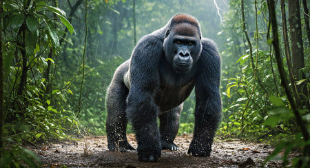 A powerful silverback gorilla in a tropical forest