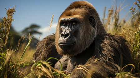 a gorilla, rendered in maya, sits in the grass with the sun shining on it. this close-up photo, in the style of daz3d, captures the majestic presence of the gorilla. the talented photographers aleksi briclot, emek golan, and national geographic have contributed to the creation of this stunning image, which showcases the beauty of the gorilla in the angura kei style. ai generated