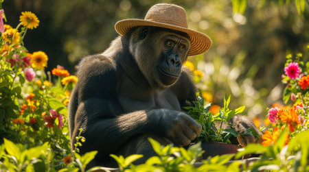 An AI-generated illustration of a gorilla wearing a straw hat gardening amidst vibrant flowers