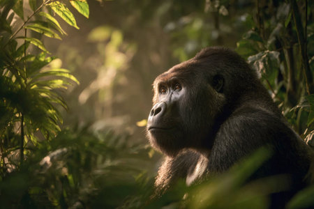 Gorilla enjoying the sunlight filtering through the dense jungle vegetation