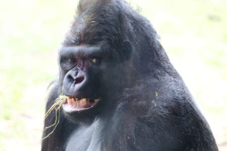 The western lowland gorilla (Gorilla gorilla gorilla) silver-back male in the green grass. Detail. Portrait. Green grass in the background. Morning sun.