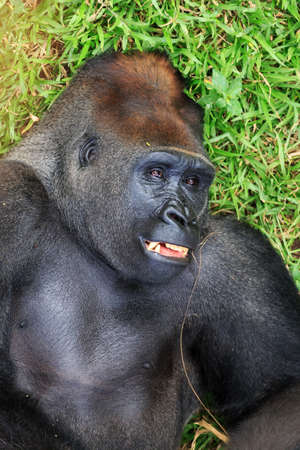 Male gorilla lying on the grass with a lost look.
