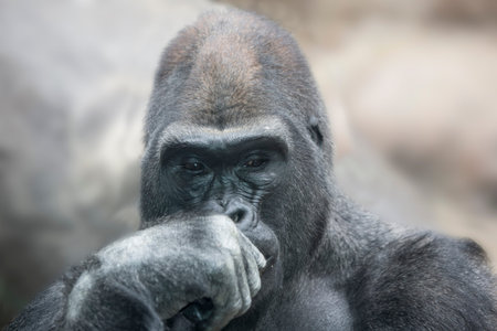 horizontal portrait of a male gorilla biting on his finger