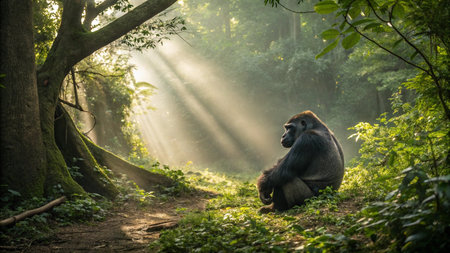 Gorilla in the rainforest in the morning light