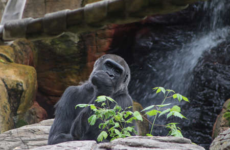 Gorilla sitting on a rock in front of a waterfall.
