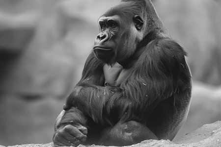 Portrait of a gorilla sitting on a rock in black and white