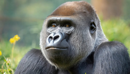 A thoughtful portrait of a male gorilla, the deep wrinkles on his face reflecting the wisdom and strength of this magnificent wildlife mammal.