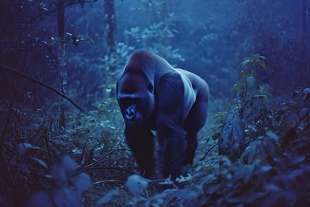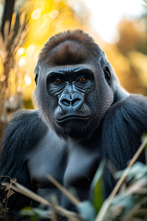 A powerful gorilla gazes intensely revealing its wise and emotional nature in the fading light.