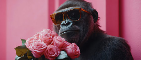 Gorilla in sunglasses holding a bouquet of pink roses against a pink backdrop