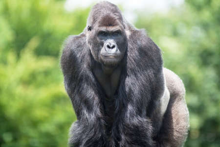 Face of a silverlplated gorilla looking straight ahead. African wild animal. It is a primate similar to the monkey