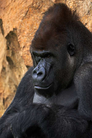 Silverback gorilla leaning on a rock looking away in a zoo in Valencia, Spain
