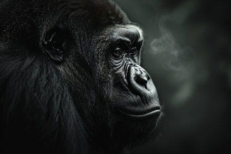 Close-up of a gorilla's contemplative expression amidst a dark ambiance