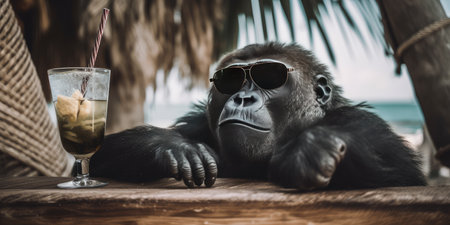 gorilla is on summer vacation at seaside resort and relaxing on summer beach