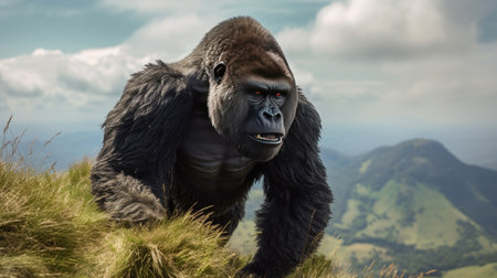 An AI generated illustration of a majestic gorilla standing in a tranquil grassy field