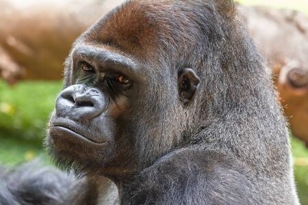 The face of the dominant male gorilla close-up, expresses emotions - discontent and irony, malicious mockery.