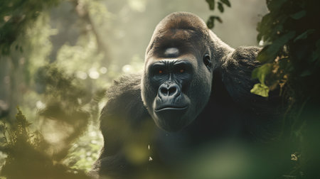 Close-up portrait of a powerful gorilla in its lush rainforest habitat.