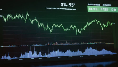 Close-up of a stock market analysis chart with a mix of bar graphs and line graphs highlighting key data
