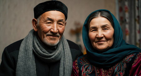 Elderly asian couple in traditional attire with warm smiles at home