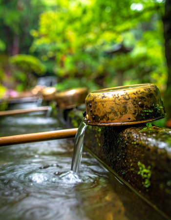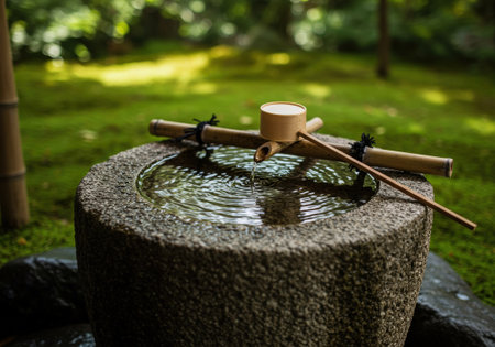 Traditional Japanese ladle for purification in a cleansing well in a peaceful Japanese temple.