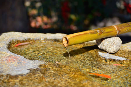 Old stone chozubachi for ritual ablution with traditioanl bamboo cane in Japan