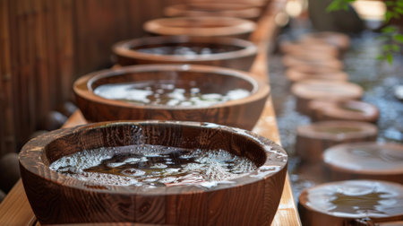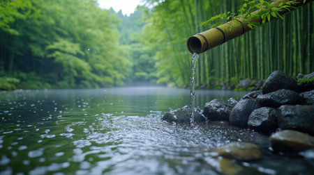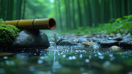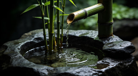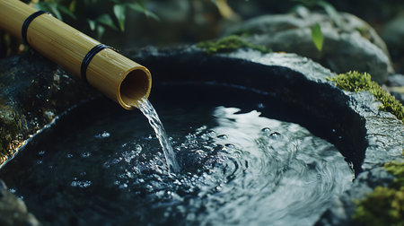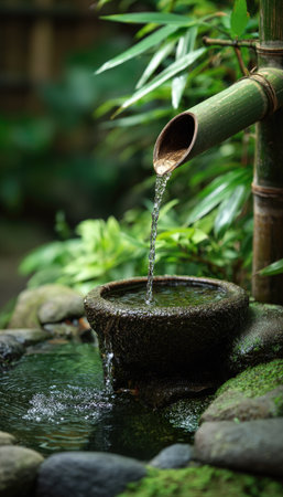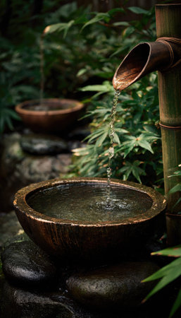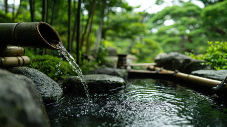 Water gently flows from bamboo pipes, creating a peaceful and relaxing ambiance in a Japanese garden