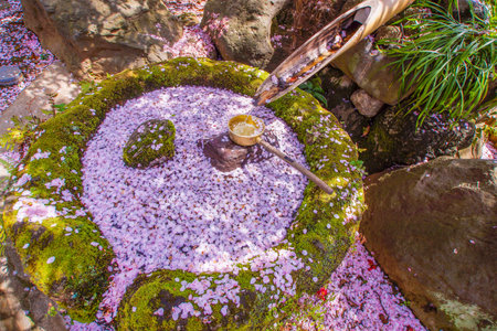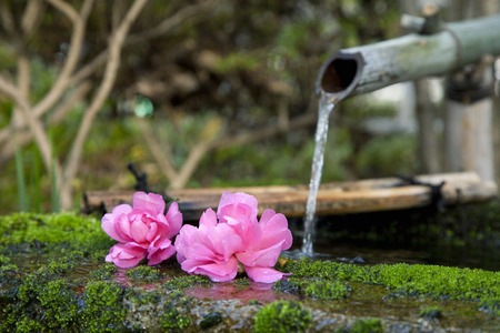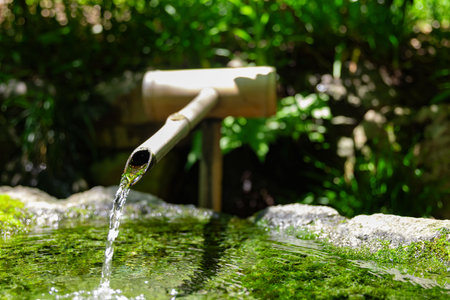 Traditional japanese tsukubai in a zen garden pouring fresh water in a bamboo bowl