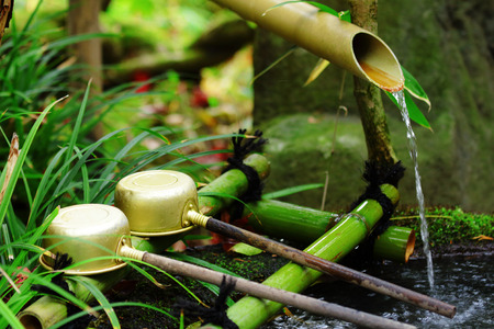 Bamboo water fountain with ladle in Japanese temple