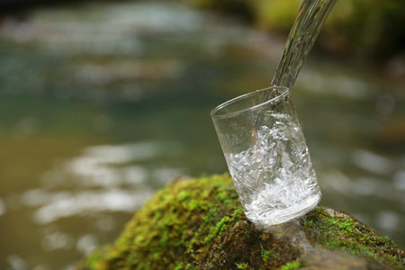 Fresh water pouring into glass on stone with moss near river. Space for text