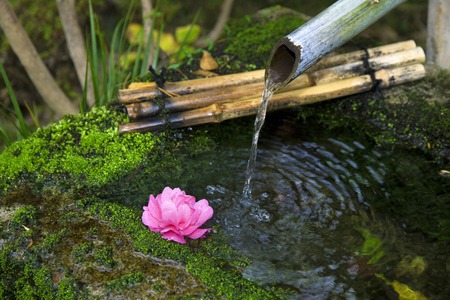 Japanese zen garden bamboo and stone water fountain outdoors
