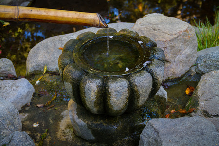 Traditional Bamboo Fountain with running water in Japanese park