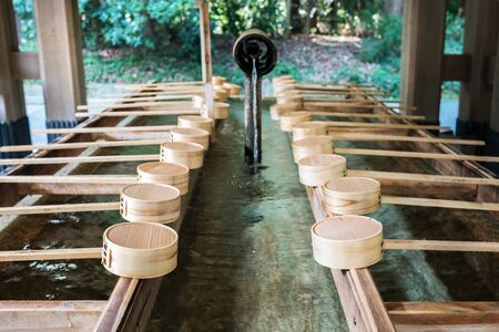 Bamboo wood dipper put sorted on basin traditional japanese in temple