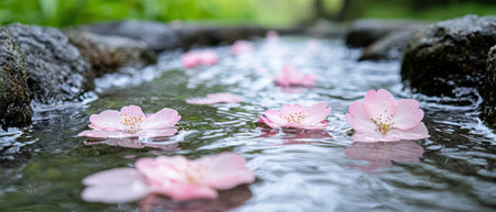 A peaceful Japanese garden scene featuring gently floating cherry blossom petals on water. Stones create a tranquil path through lush greenery, evoking serenity.