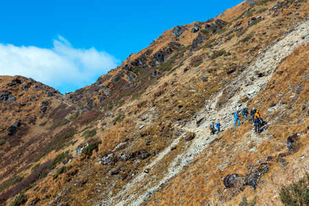 HIMALAYA, INDIA - APRIL 8, 2010: Trekking in the Himalayas, people climb the beautiful trail in sunny spring day.
