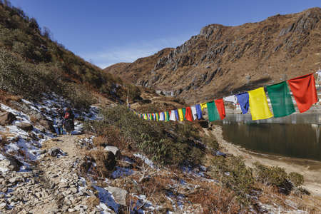 Tibetan prayer flags with Black mountain with snow on the top is background at Thangu and Chopta valley in winter in Lachen. North Sikkim, India.