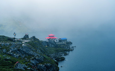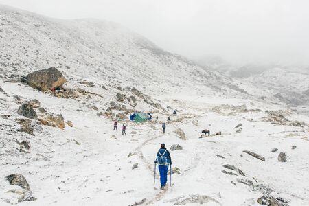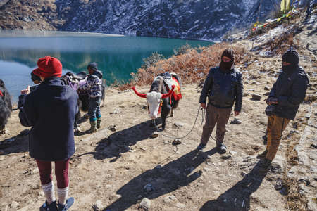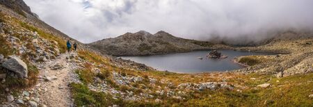Panoramic view of beautiful dramatic mountain landscape over Gosaikunda Lake in Himalayas (Langtang Park) with group of tourists with backpacks taking photos. Beautiful panoramic landscape, trekking and activity.