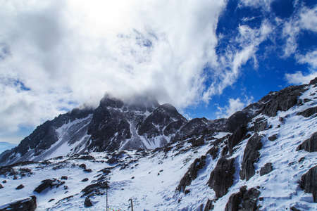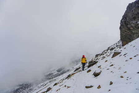 Atmospheric minimalist alpine landscape with snowy rocky mountain peak. Low clouds near snowbound range. Rocks with snow in mist. Craggy mountains in fog. Majestic misty foggy scenery on high altitude