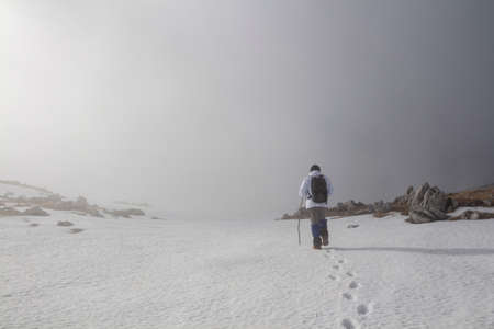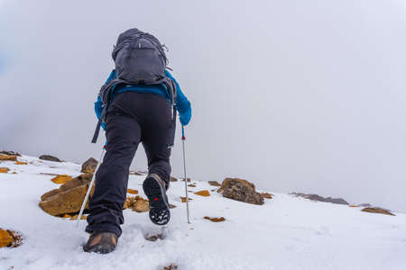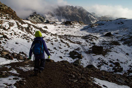 The back of mountaineer tourist looks at the peak, standing against a winter mountain landscape.