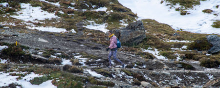 Woman walking trough path at martial glacier, ushuaia, Tierra del Fuego, Argentina