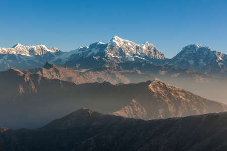 Misty sunrise over snowy mountains landscape with stunning hills lit up by first sun light on the foreground and snowy mountain peaks on the background, Himalayas, Nepal.