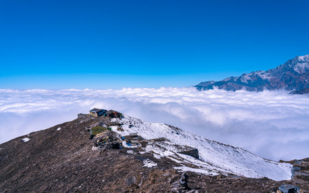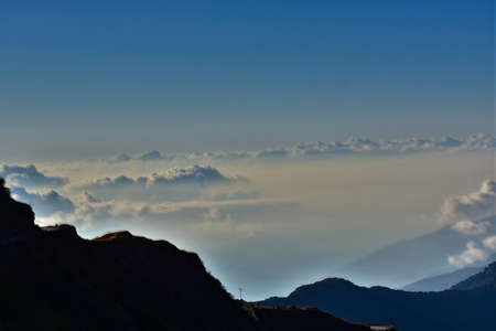 Top of the hill wrapped with the morning fog at Snow covered mountains. Beautiful Fog and white clouds over the mountain.