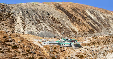 Himalaya valley settlement on Mera peak climbing route. Khare village, Makalu Barun National Park trek in Nepal.