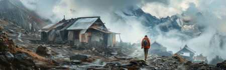 Himalayas, India. Panoramic view of Himalayas. Man with backpack standing in front of the temple.