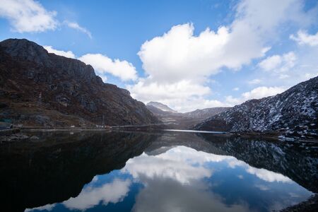 Lake in valley with mountains and blue sky and clouds background, Himalaya mountains in India