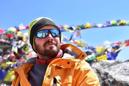 Portrait of a trekker at high mountain, buddhist prayer flags background.